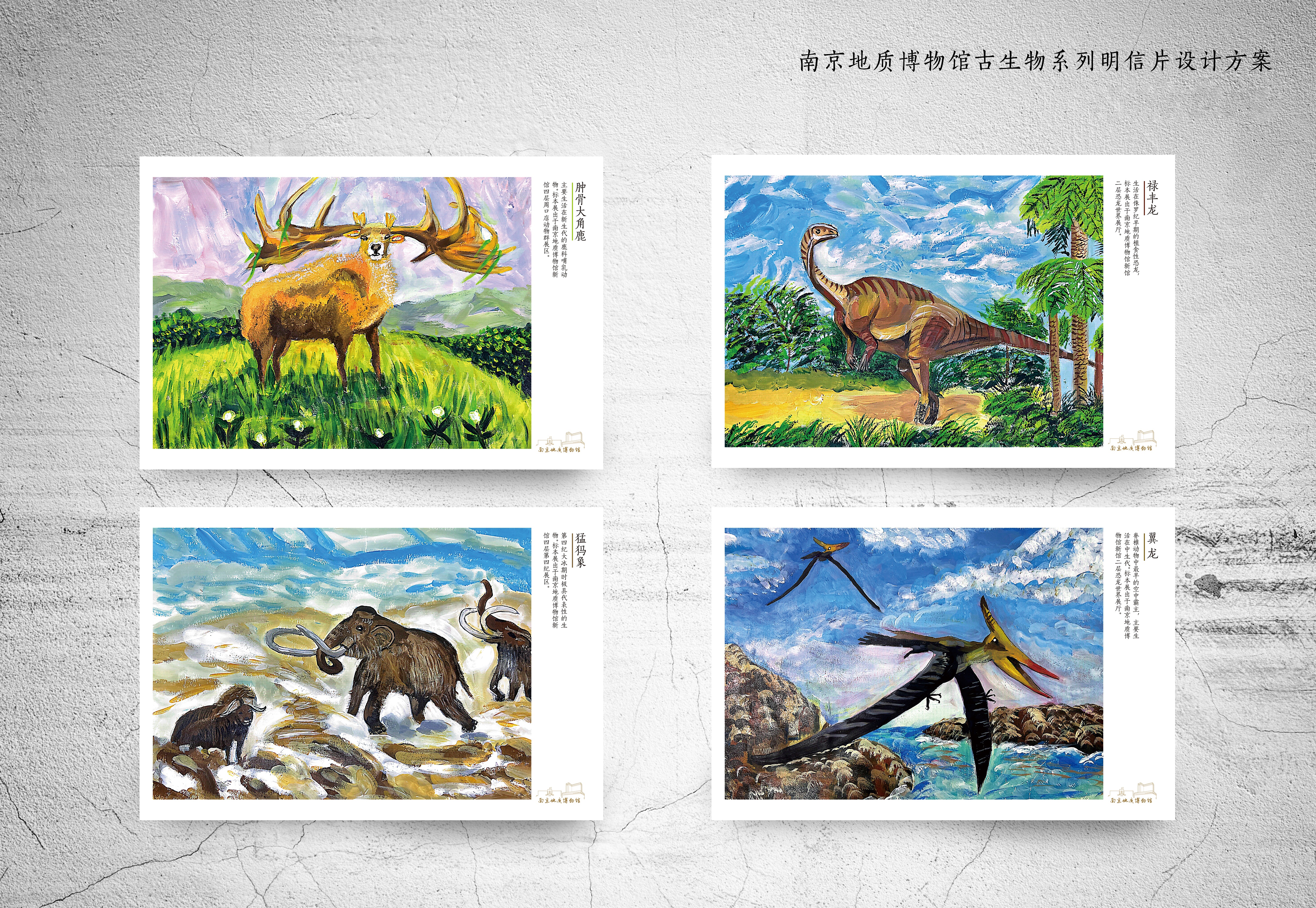 “遇见古生物”系列:“遇见古生物”系列手绘明信片以远古生命化石标本为创作灵感,跨越亿万年时光,唤醒沉睡在地层中的生命印记。以精湛设计再现古生物的独特魅力,让沉寂的化石重焕生机,定格史前生命最动人的姿态,让遥远的史前文明变得亲切可感。一张张明信片如同来自远古的书信,在触摸与观赏间,开启一场跨越时空的生命对话。该系列明信片于2024年获“第十届江苏省科普公益作品大赛”一等奖。